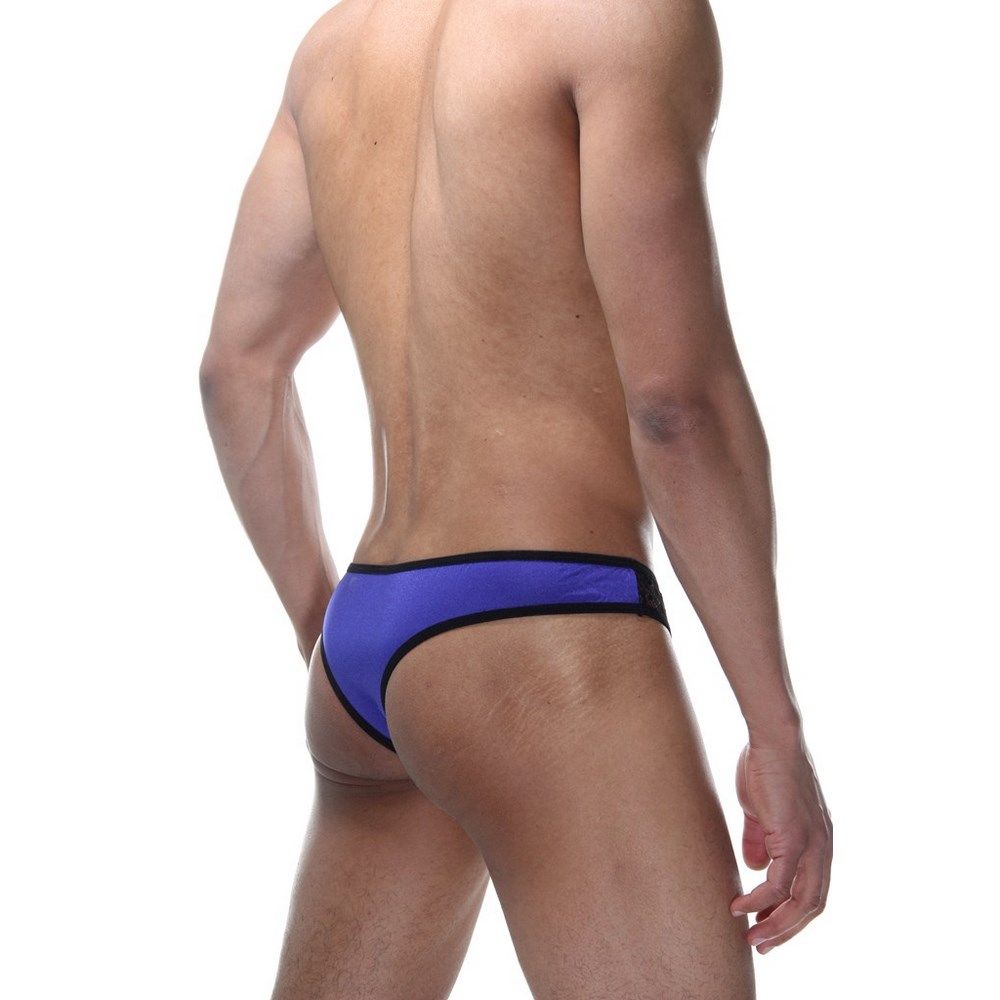 Бразилиана для мужчин, из тонкой полупрозрачной черной ткани-сетки и мягкого тянущегося материала ярко-василькового цвета.