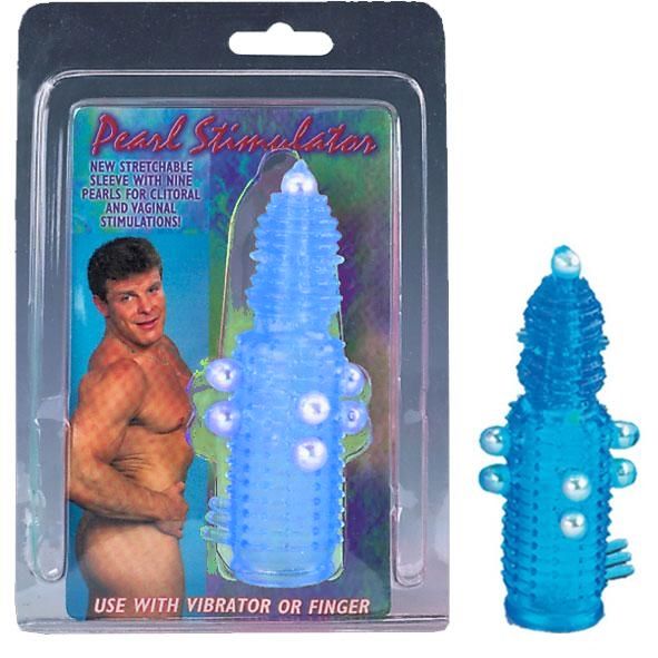 Голубая эластичная насадка на пенис с жемчужинами, точками и шипами Pearl Stimulator. Прирост длины - 3 см. Внутренний диаметр - 2 см.