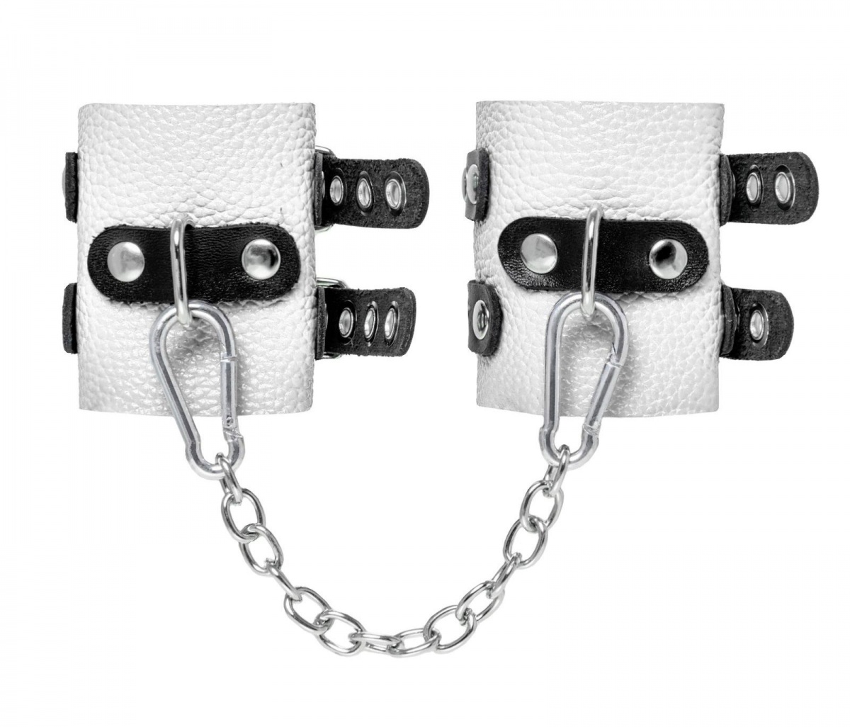 Основатели бренда уверены: лучший способ избавиться от искушения - поддаться ему! Мягкие, белые, кожаные наручники с двумя чёрными, жёсткими ремнями могут стать стильным аксессуаром, а могут послужить вашим целям по своему прямому назначению. Частичное обездвиживание и невозможность двигать руками дают вам полную власть над партнером – взрослые игры для взрослых. Наличие двух колец и карабинов, соединенных между собой металлической цепочкой, позволяет использовать изделие как раздельно – аксессуар-манжеты, так и как наручники для фиксации. К широким металлическим кольцам также можно присоединить и другие аксессуары при помощи карабинов. Благодаря универсальному размеру наручники могут использоваться и мужчинами, и женщинами. Длина манжет - 18 см, ширина - 7 см. Длина сцепки - 17 см.