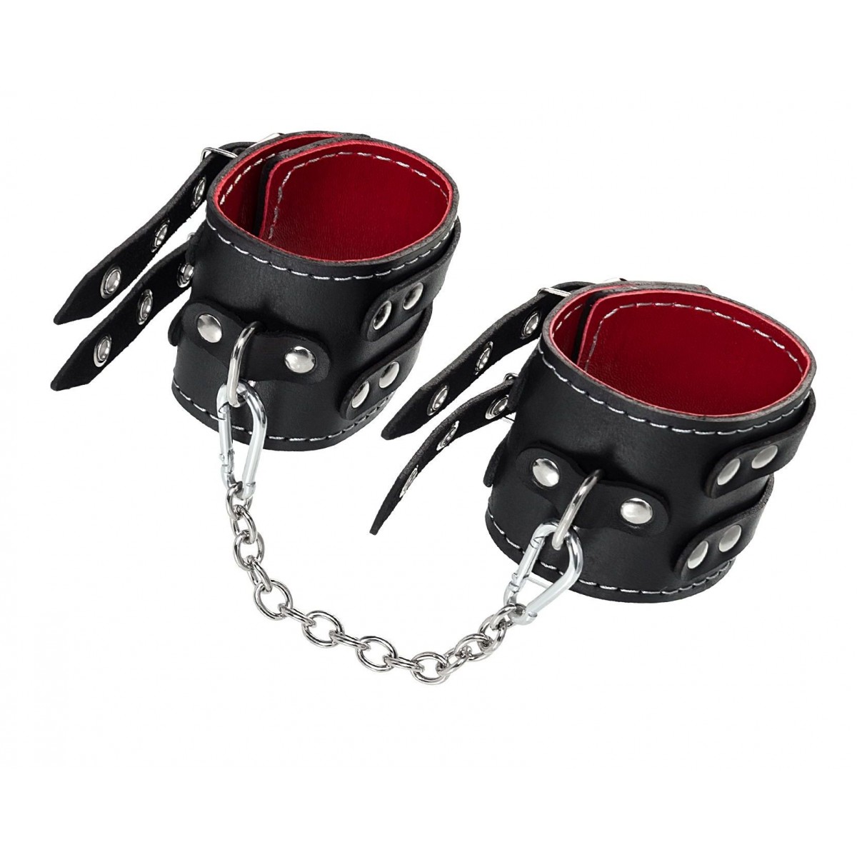 Эти кожаные оковы с двумя ремнями и красной подкладкой могут стать стильным аксессуаром, а могут послужить вашим целям по своему прямому назначению. Частичное обездвиживание и невозможность двигать руками или ногами дают вам полную власть над партнером – взрослые игры для взрослых. Наличие двух колец и карабинов, соединенных между собой металлической цепочкой, позволяет использовать изделие как раздельно – аксессуар-манжеты, так и как оковы для фиксации. К широким металлическим кольцам также можно присоединить и другие аксессуары при помощи карабинов. Благодаря универсальному размеру оковы могут использоваться и мужчинами, и женщинами. Размер легко регулируется с помощью металлических пряжек, органично вписывающихся в общий стиль. Длина манжет - 20 см, ширина - 7 см. Длина сцепки - 13 см.
