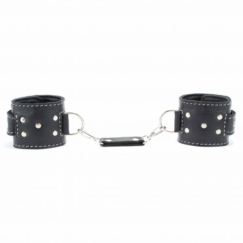 Чёрные кожаные оковы с крупной строчкой.