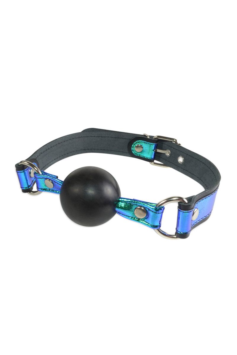 Эффектный девайс в виде сферического кляпа с яркими ремешками из натуральной высококачественной кожи чёрного цвета, сделает ролевые игры особенно страстными и запоминающимися. Ремешки кляпа декорированы голографическими вставками синего цвета, который отливает изумрудным, салатным и бирюзовыми оттенками. Кляп-шар не способен повредить зубы и прост в гигиеническом уходе, достаточно промыть теплой водой с мыльным раствором. Легко зафиксировать девайс на шее и отрегулировать размер можно при помощи пряжки. Вся используемая фурнитура имеет хромированное покрытие. Ширина ремешков - 2,5 см. Диаметр шара - 4,5 см.