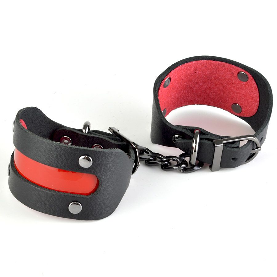 Наручники изготовлены из натуральной кожи и декорированы яркой красной вставкой из экокожи. Общая длина наручников - 25 см. Ширина манжет - 4 см.