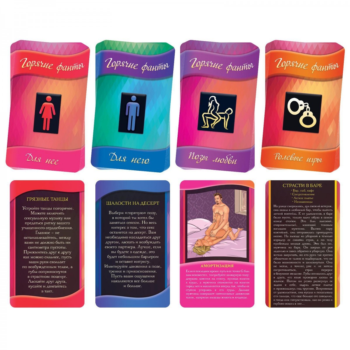 Перед вами игра для двоих… Игра, раскрывающая самые сокровенные фантазии… Игра, способная подарить невероятное наслаждение. Каждое задание, которое вы найдёте в ней, будет подливать масла в огонь ваших чувств, готовых запылать с новой страстью. Вас ждут невероятные сексуальные эксперименты, которые вознесут вас на вершину экстаза! В карточках «Для неё» вы найдёте задания, способные до предела возбудить желание партнера. Колода «Для него» таит в себе секреты наслаждения для партнерши. Карты «Позы любви» — это невероятные описания сексуальных позиций, сопровождающиеся откровенными иллюстрациями. А на сладкое мы приготовили колоду «Ролевые игры» — с ней вы подарите друг другу новые эмоции и ощущения. Положите перед собой четыре колоды карт, по очереди вытягивайте их и выполняйте задания. Освежите ваши чувства! В комплекте: 10 карт «Позы любви» 10 карт «Ролевые игры» 10 карт «Для него» 10 карт «Для неё» правила игры.